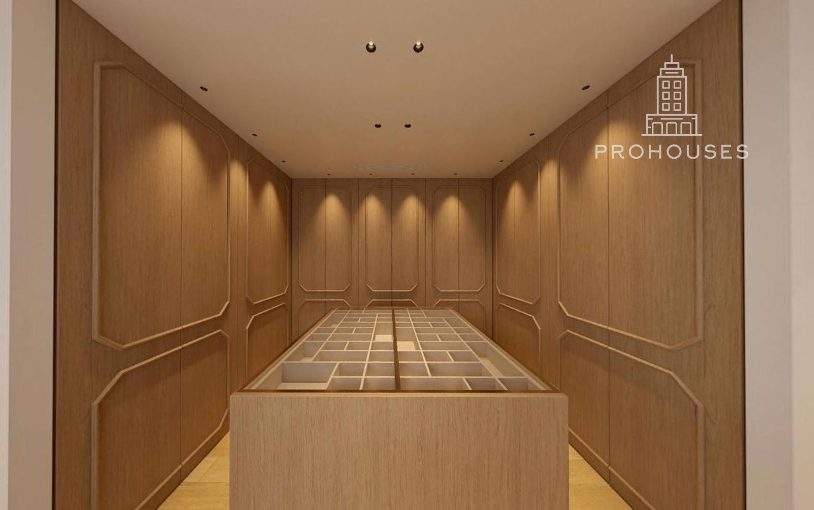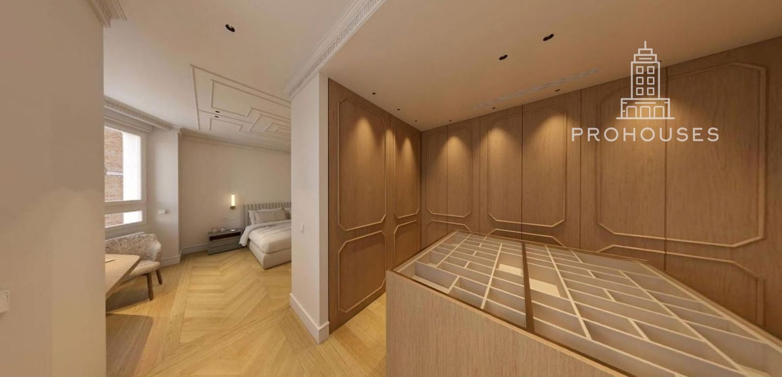 Desde el hall también se accede a un elegante despacho exterior, revestido con panelados de madera natural y con salida directa a la terraza, ideal como espacio de trabajo o biblioteca privada.
