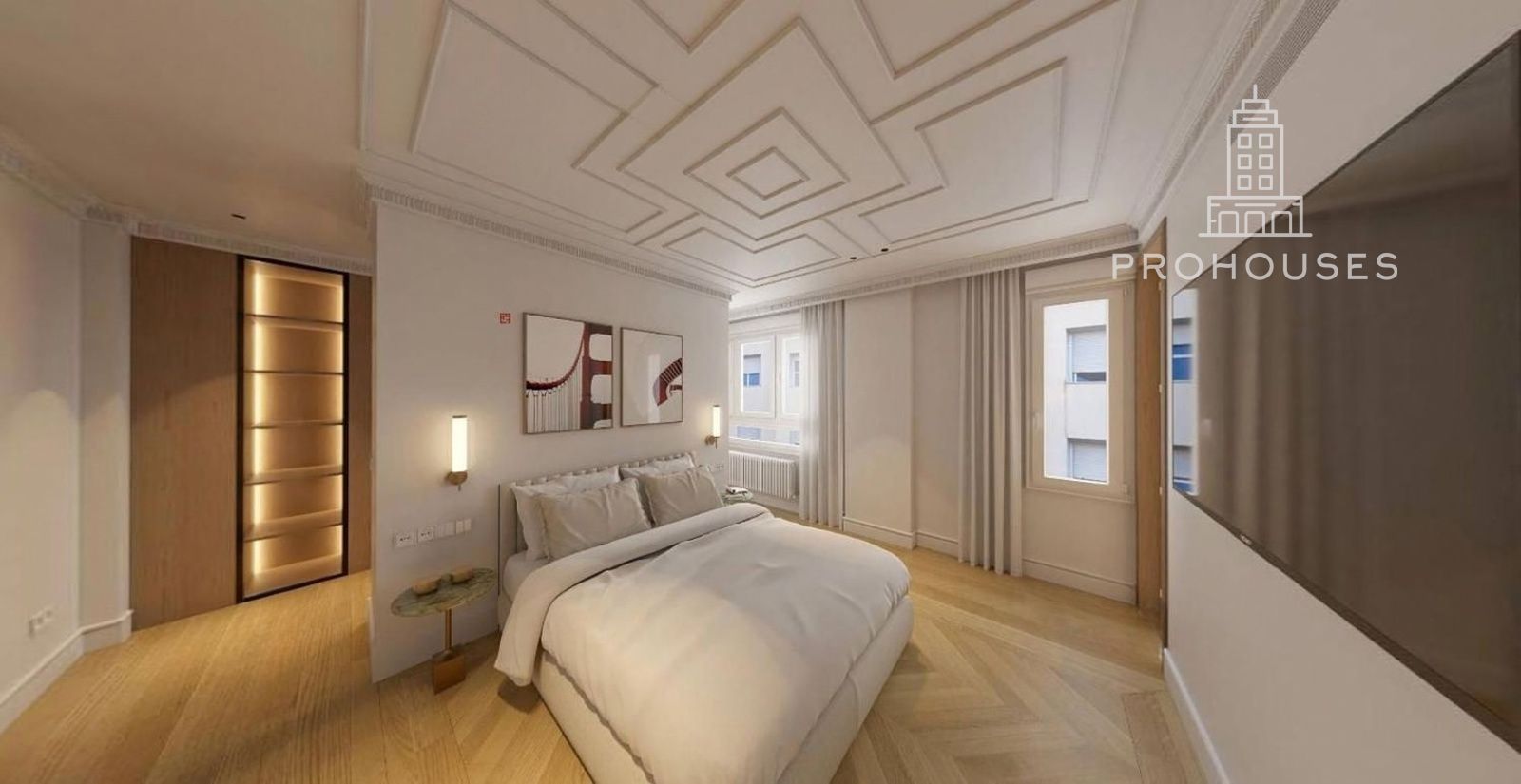Entre sus acabados destaca el pavimento de madera natural, con variación en la dirección de las lamas según la estancia, molduras de inspiración semiclásica en paramentos verticales, iluminación indirecta cuidadosamente integrada y un avanzado sistema de domótica que permite controlar iluminación y persianas motorizadas. La vivienda dispone además de climatización por conductos y carpintería exterior de alta gama Cortizo con sistema RPT, que garantiza un excelente aislamiento térmico y acústico.