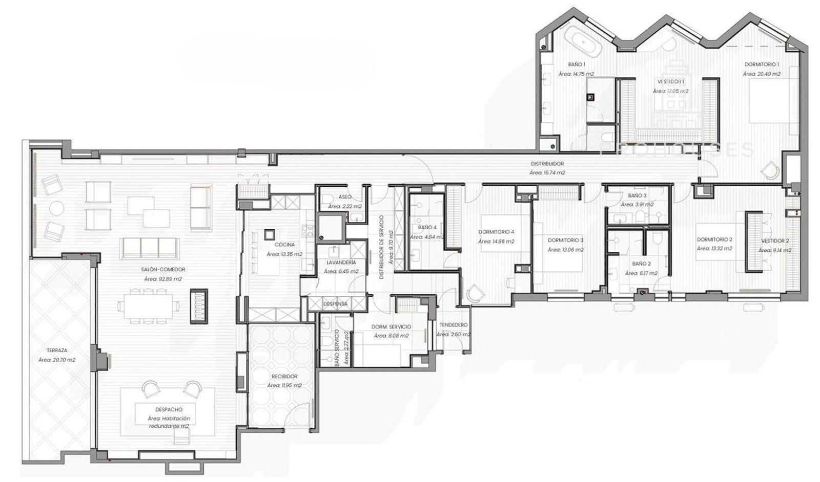 El quinto dormitorio está destinado a servicio interno, contando además con zona de plancha y almacenamiento de ropa blanca.